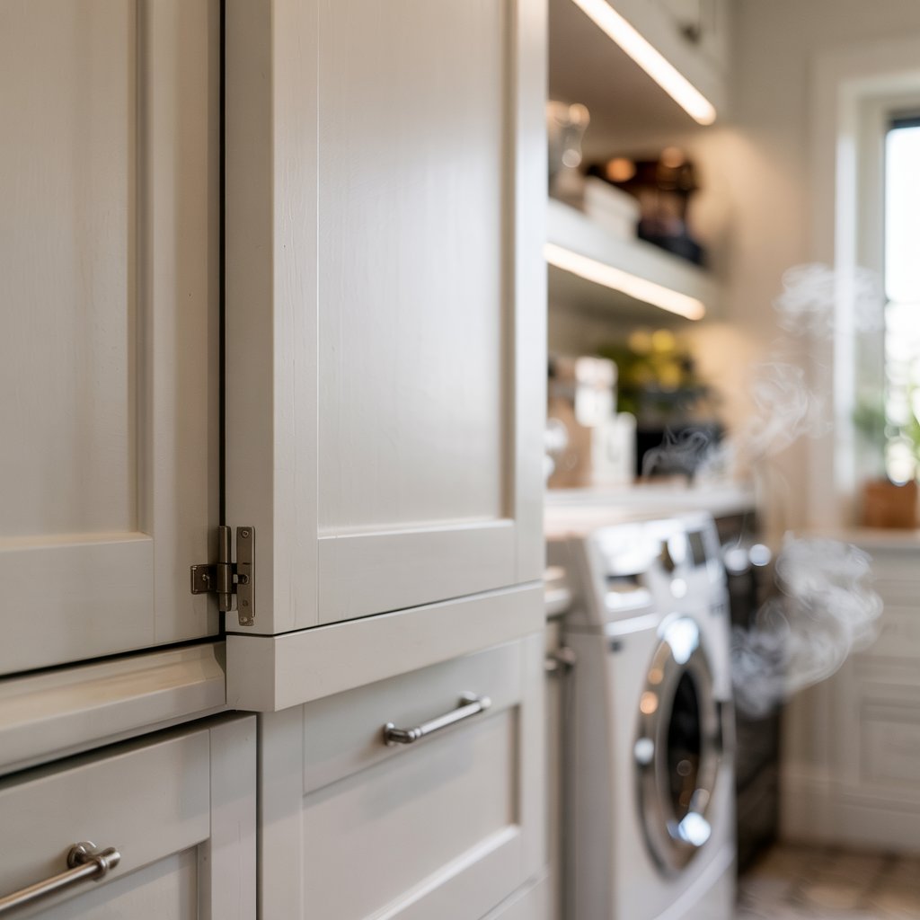 Modern high-capacity washers and dryers produce significant steam output during each cycle. In a closed or semi-enclosed utility room, this moisture penetrates untreated particleboard substrates, causing delamination, swelling, and hinge failure within two to three years. Las Vegas’s extreme heat compounds the problem: thermal cycling between the room’s ambient temperature and the dryer’s exhaust heat causes expansion and contraction that standard MDF cannot absorb without warping.